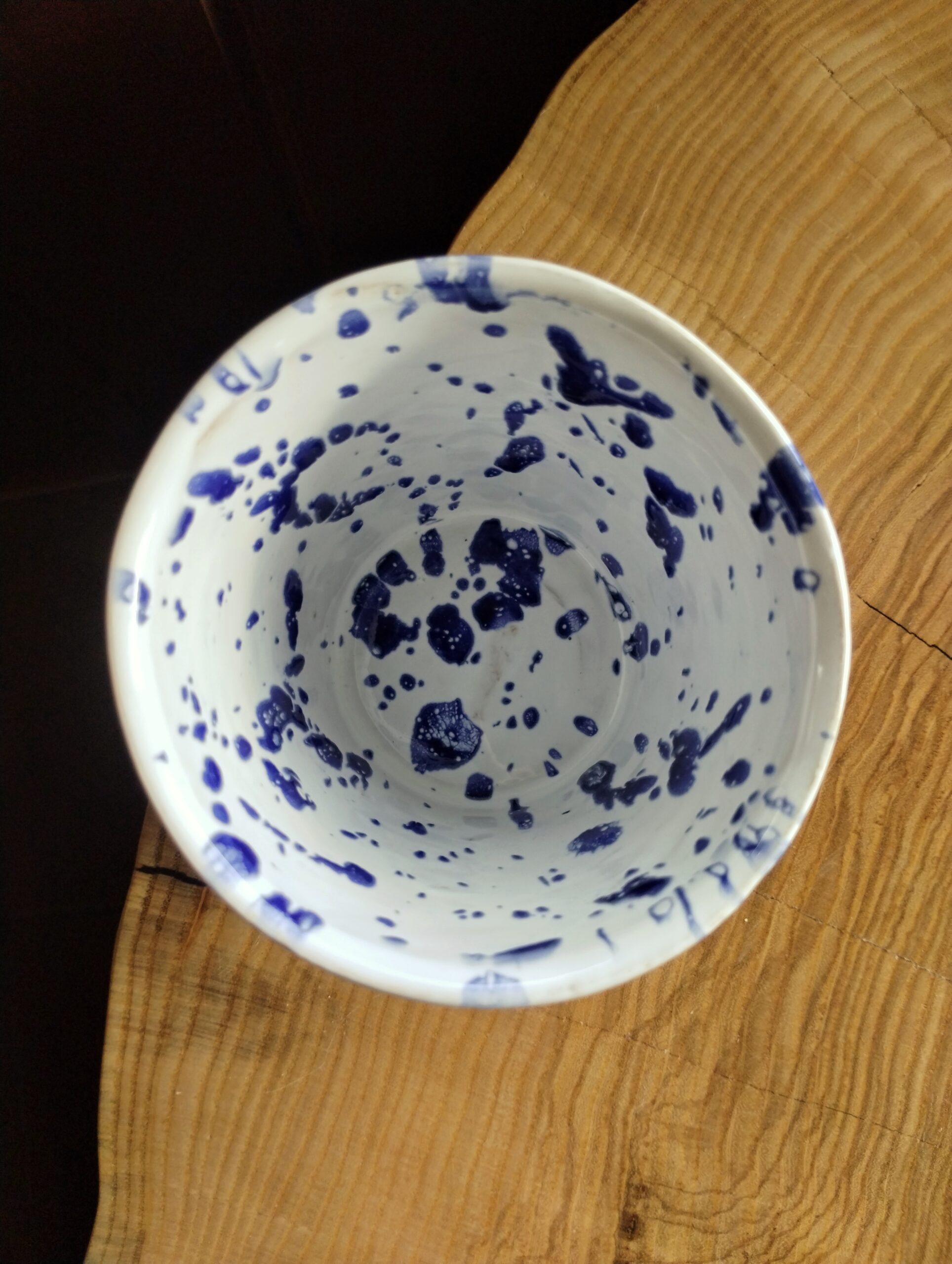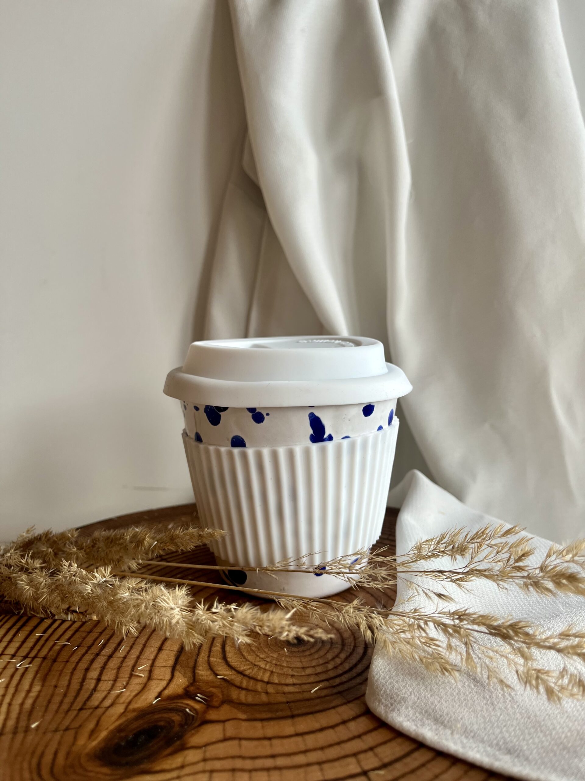 Ceramiczny kubek na wynos BIAŁY z granatowymi plamkami