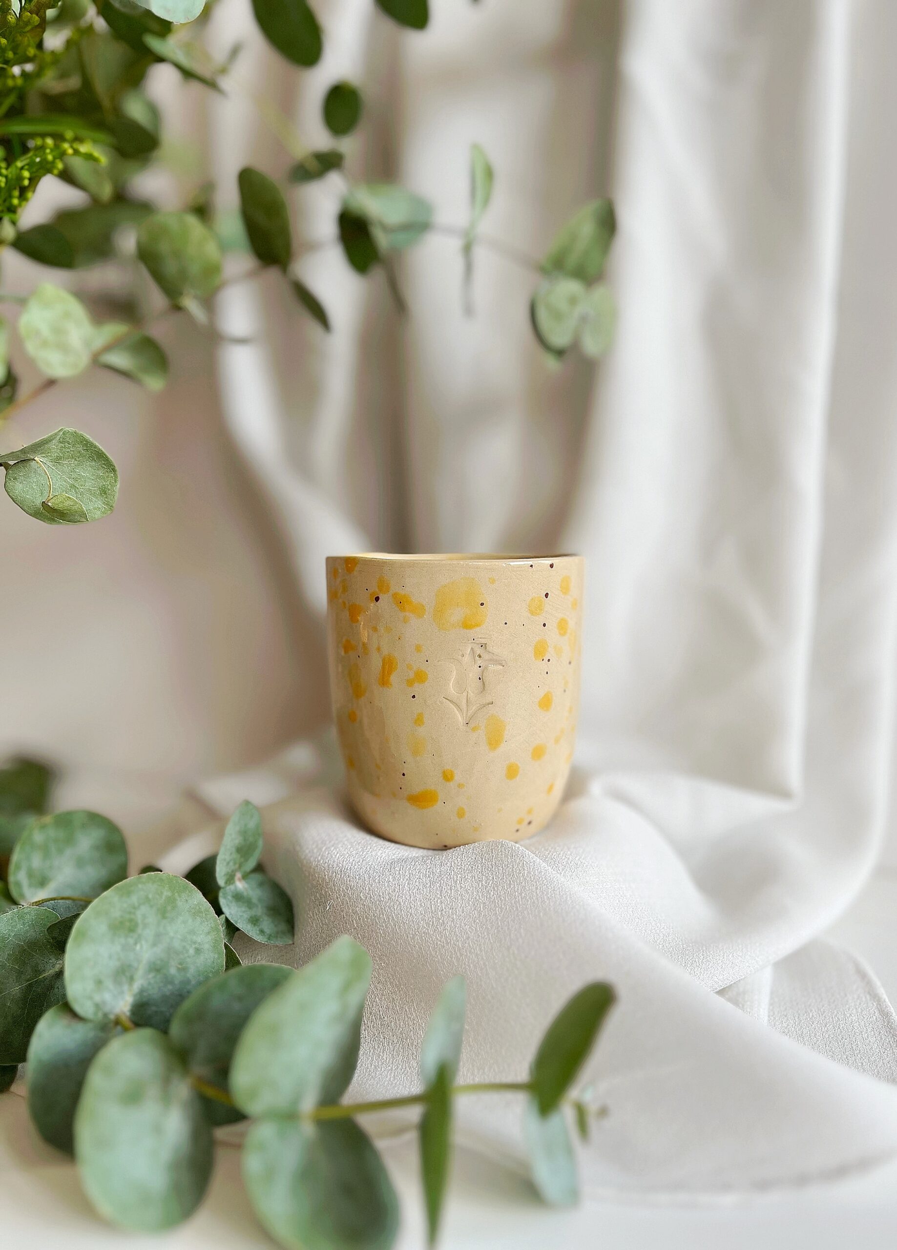Czarka w kolorze neutralnym z żółtymi ciapkami i z motywem leluji podhalańskiej