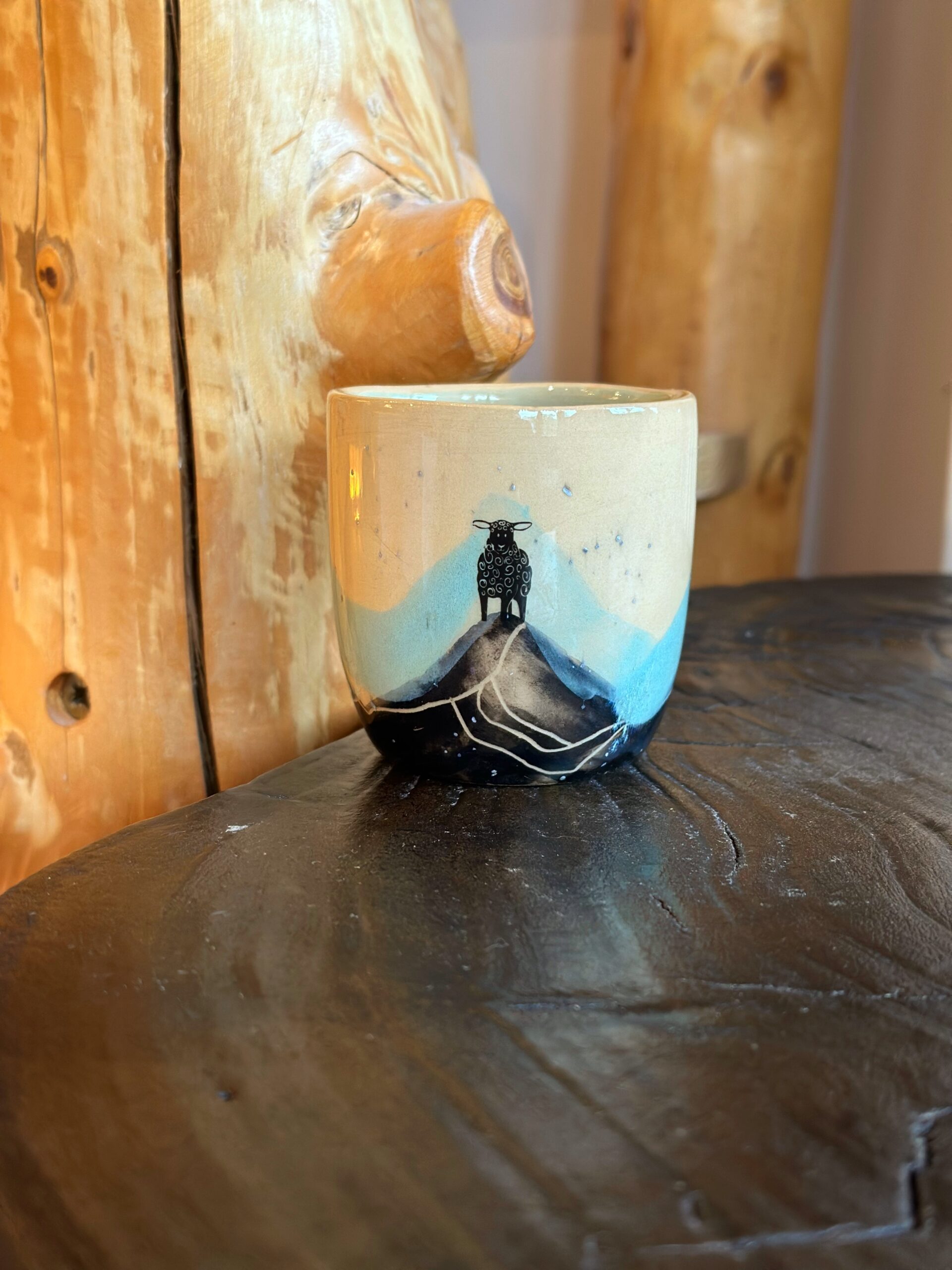 Czarka w kolorze neutralnym z niebieskim refleksem, oraz z motywem panoramy górskiej z owcą na szczycie