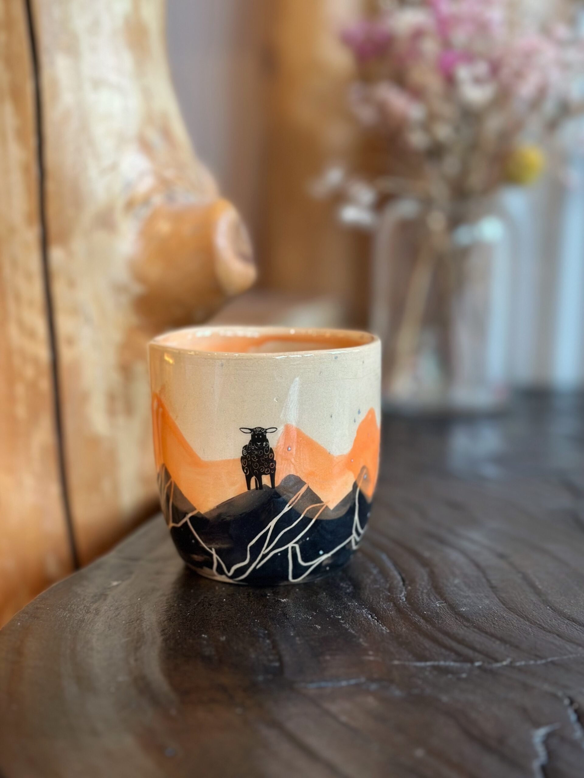 Czarka w kolorze pomarańczowym z malowaną przeze mnie panorama gór i owcą na szczycie