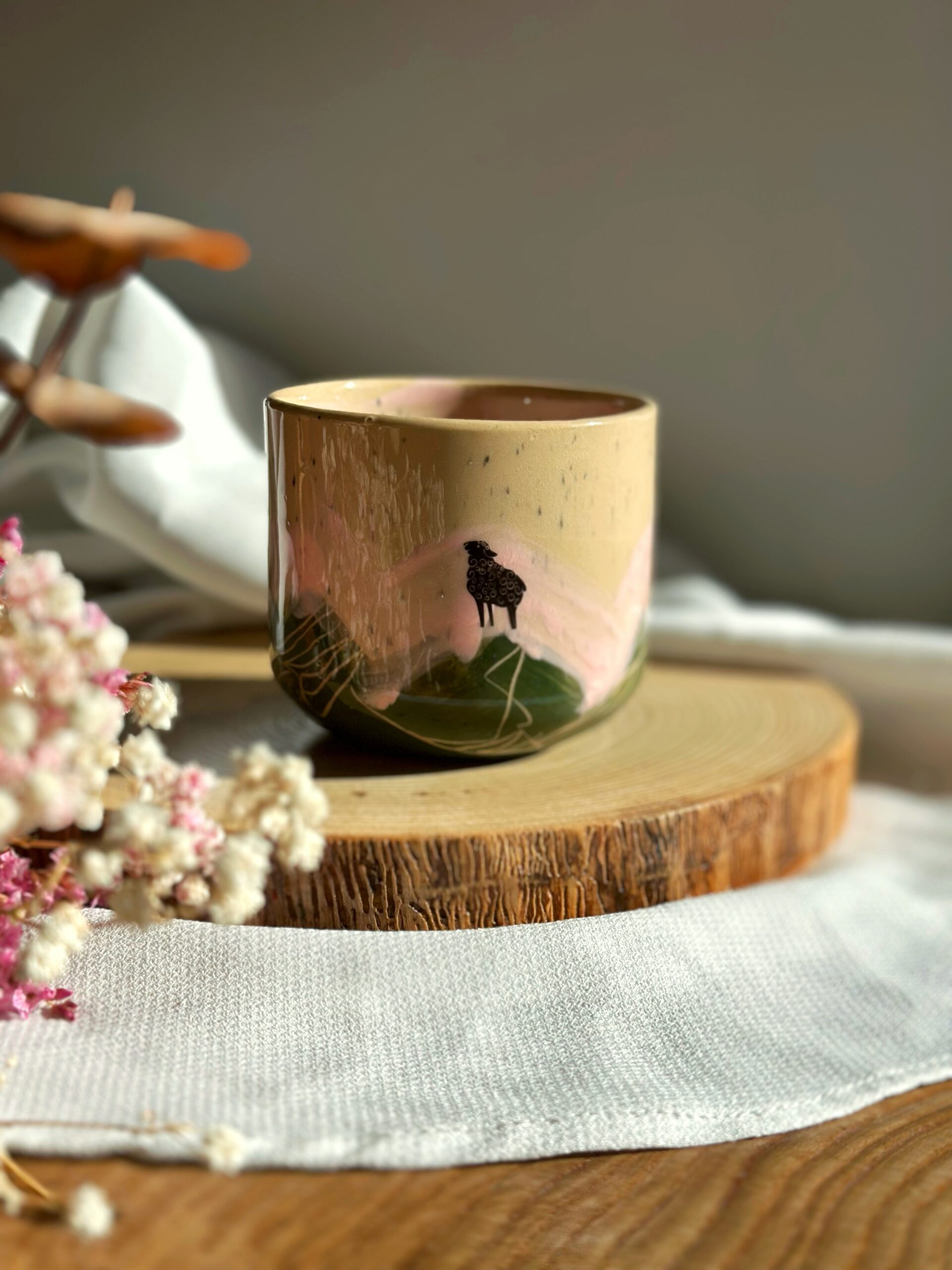 Czarka w kolorze neutralnym z różowym prześwitem, oraz z motywem panoramy górskiej w kolorze zielonym z owcą na szczycie.