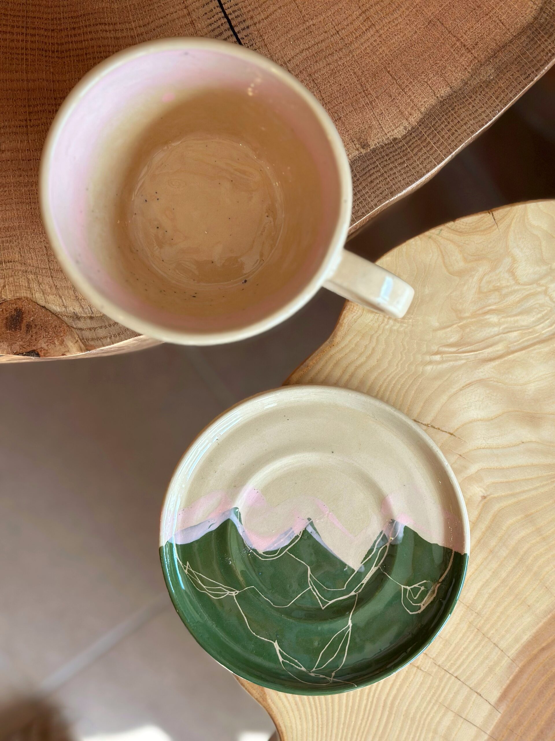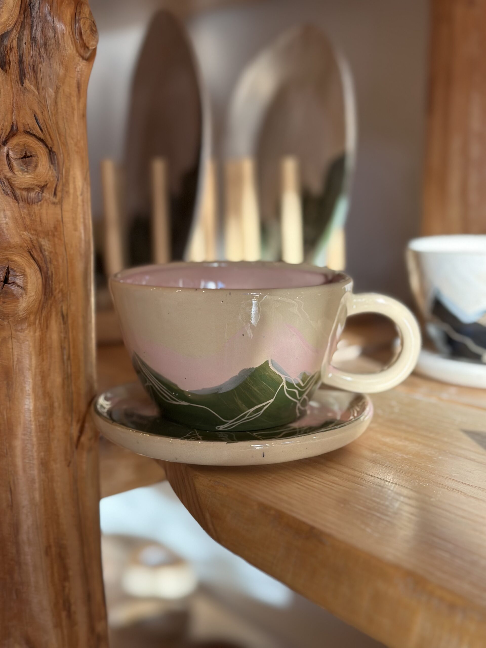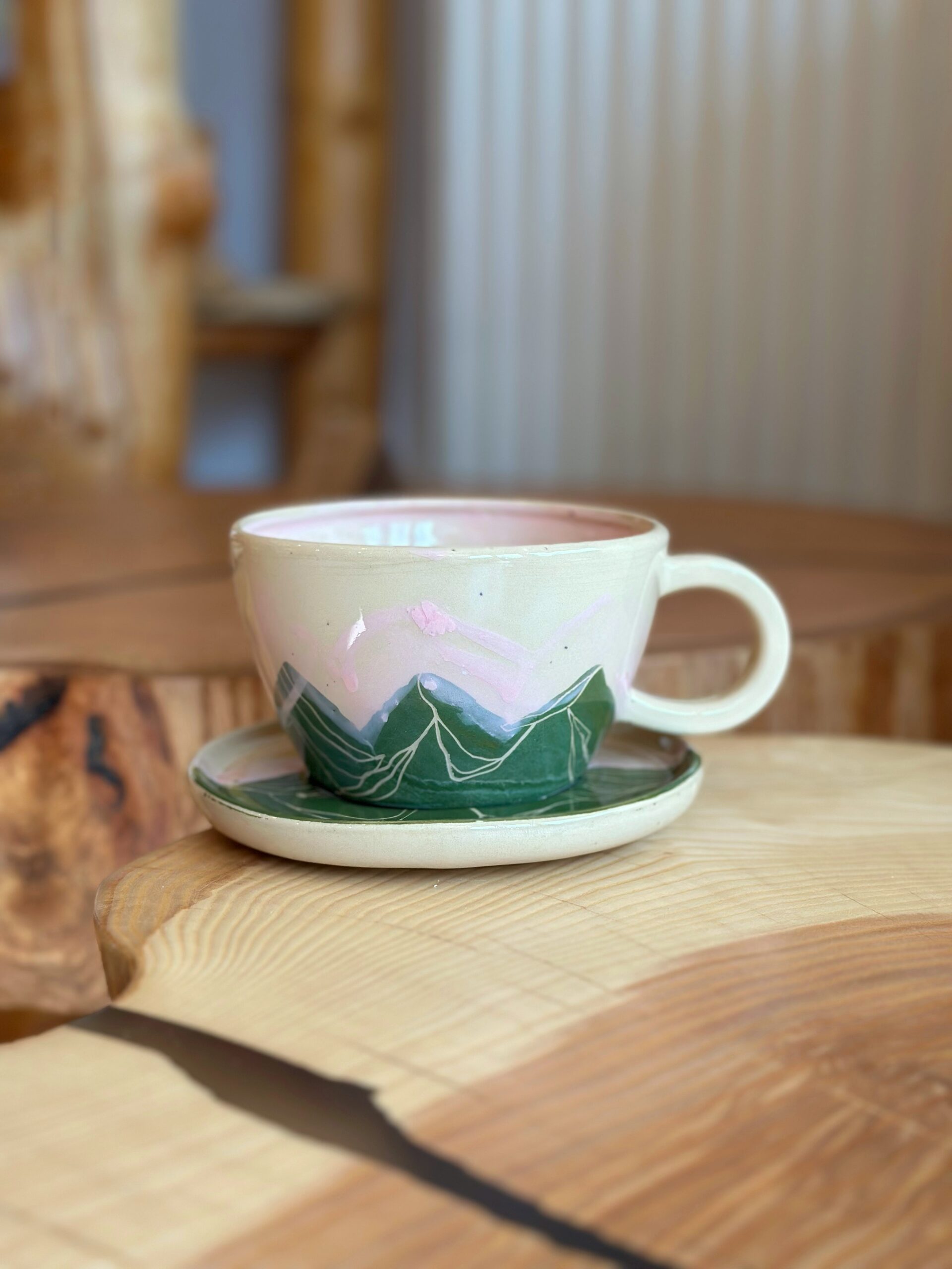 Filiżanka neutralna z malowaną przeze mnie panoramą gór w kolorze zielonym z różowym niebem