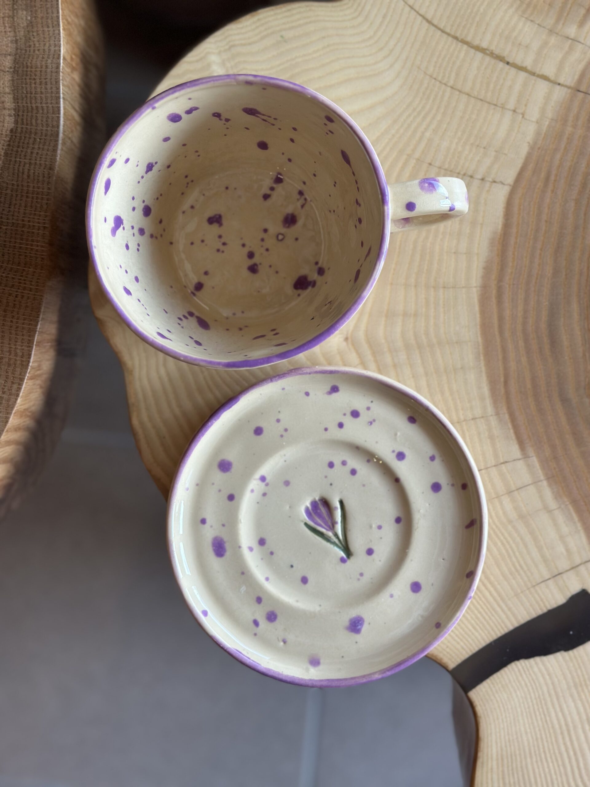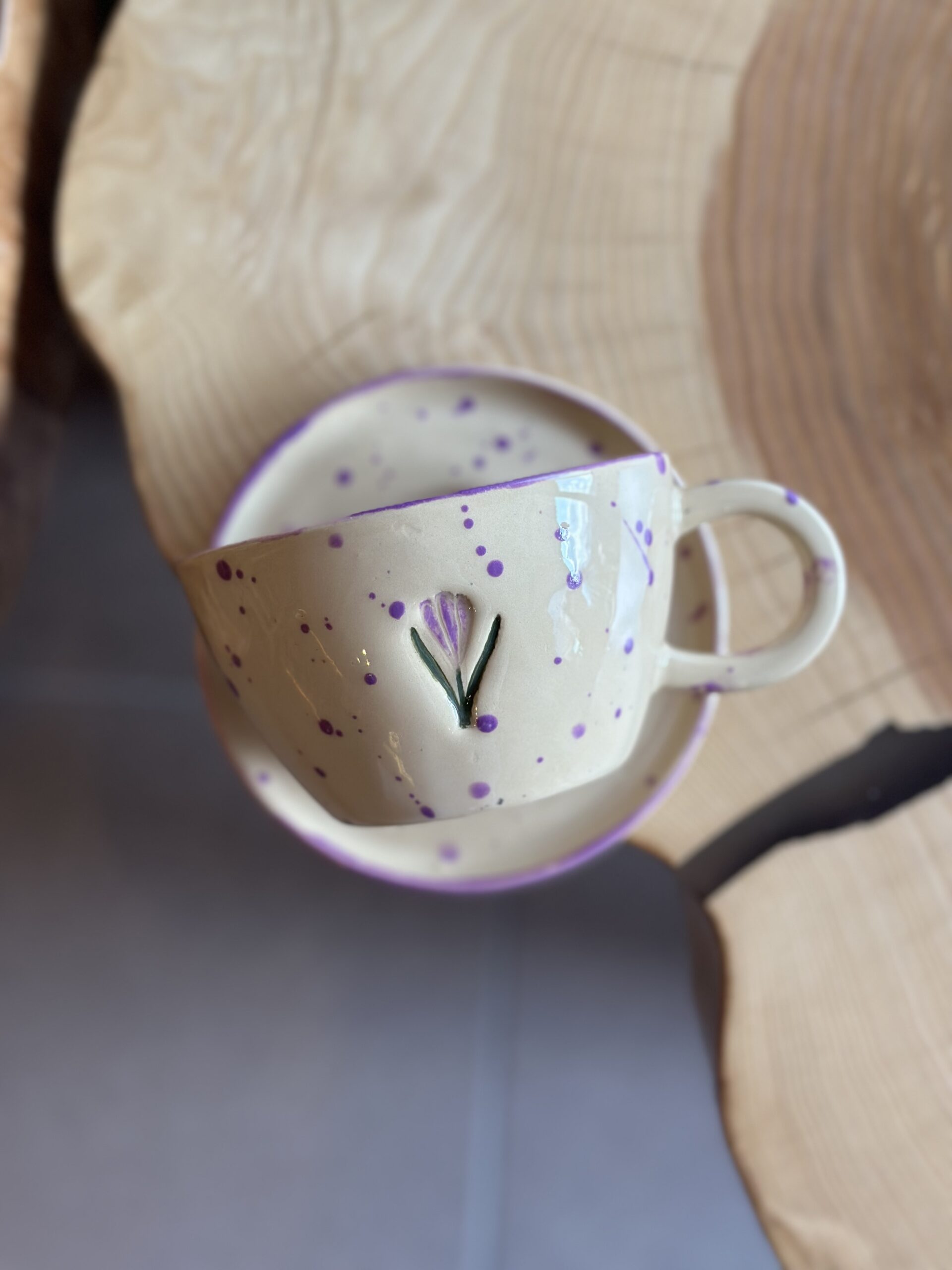 Filiżanka w zestawie ze spodkiem z malowanym przeze mnie krokusem piękna i wiosenna