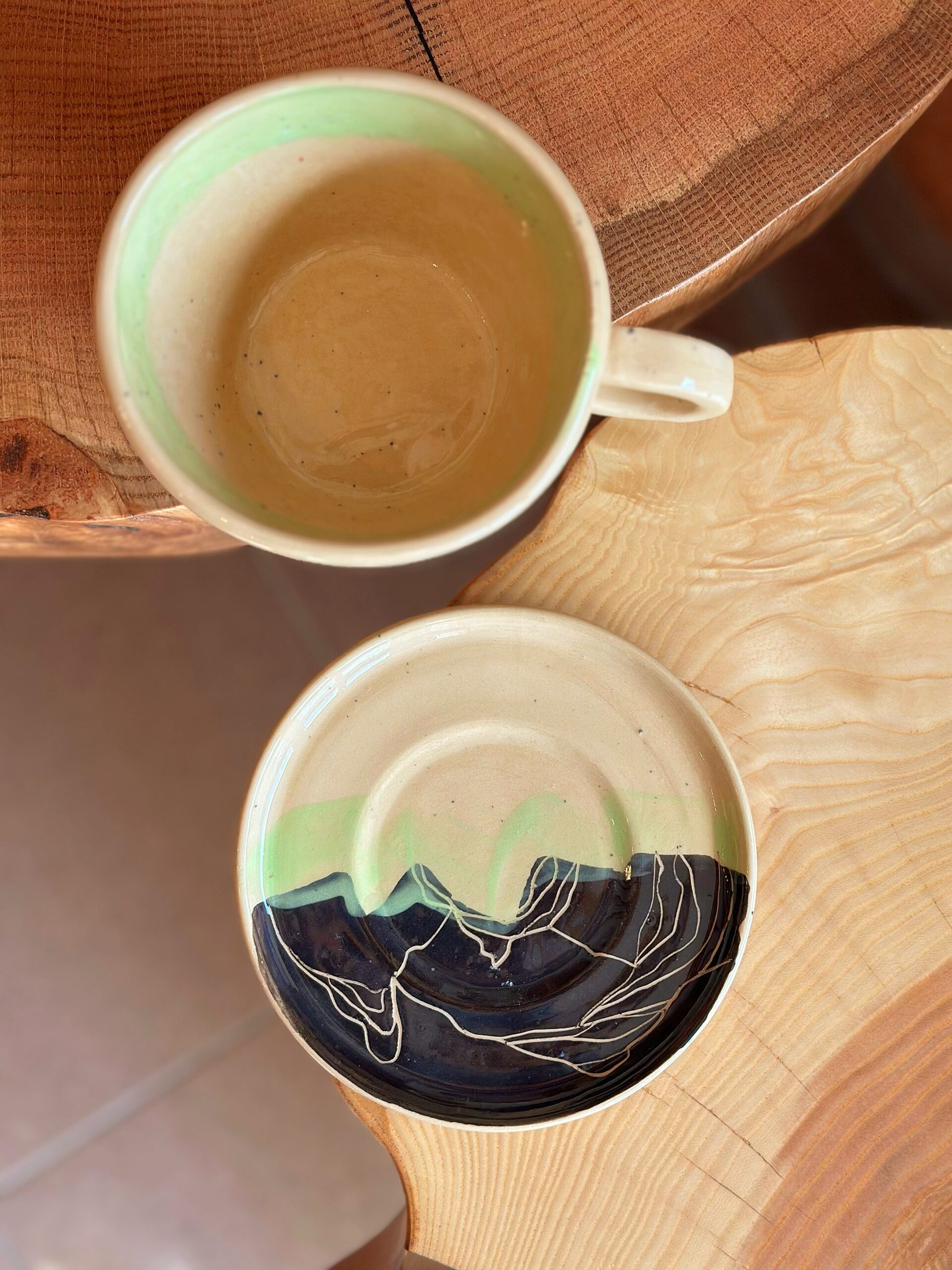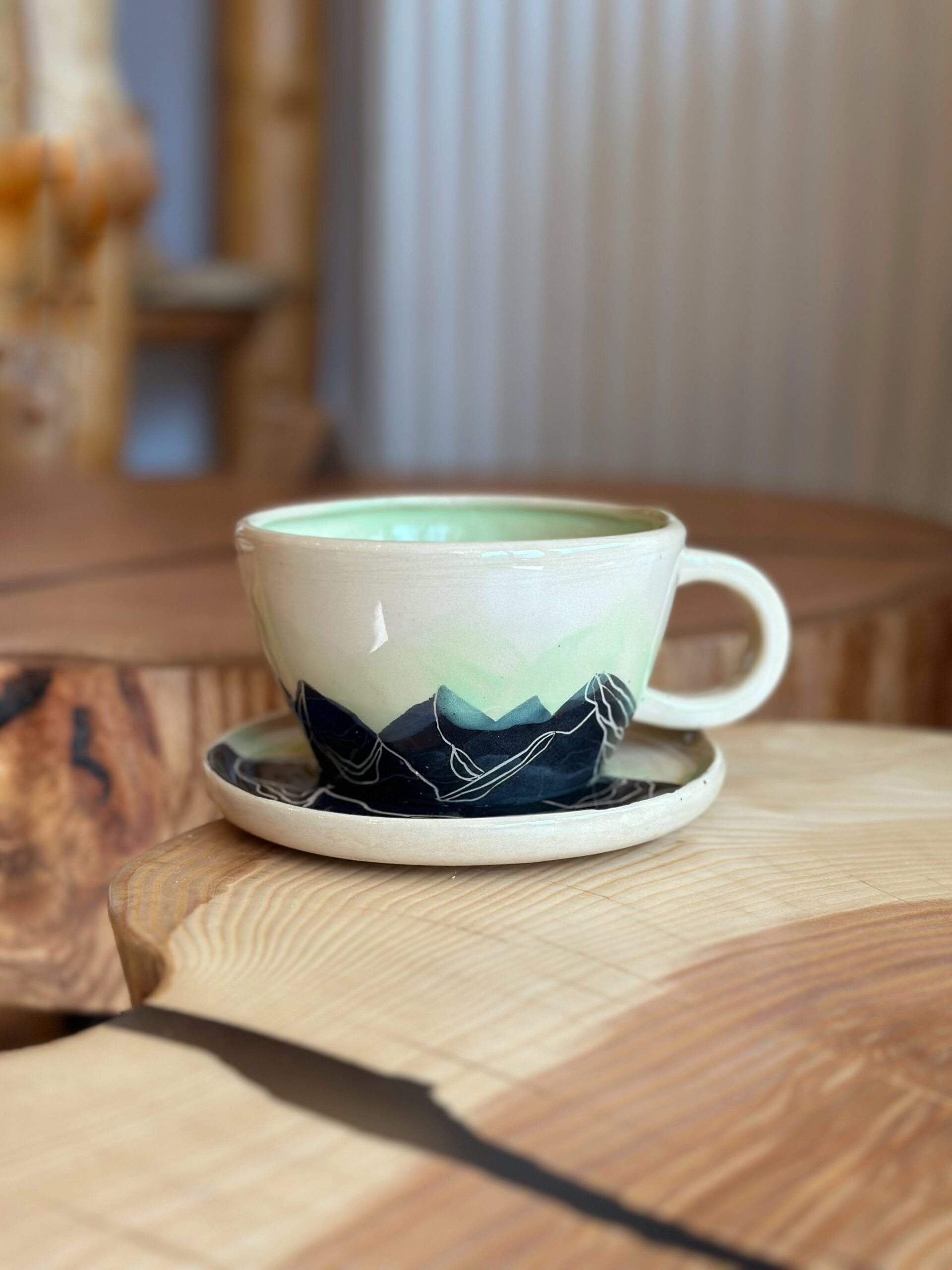 Filiżanka neutralna z malowaną przeze mnie panoramą gór w kolorze czarnym z zielonym niebem