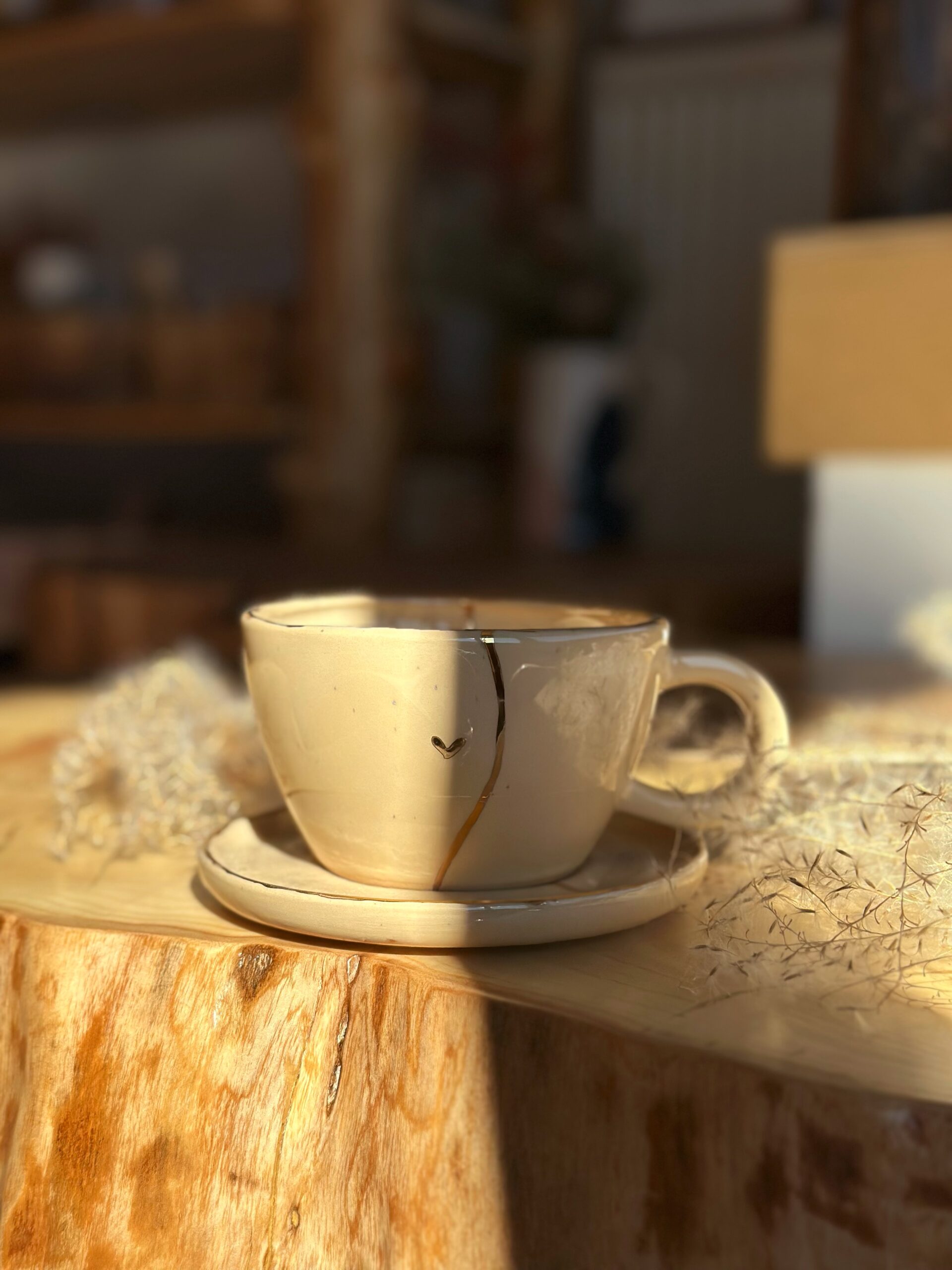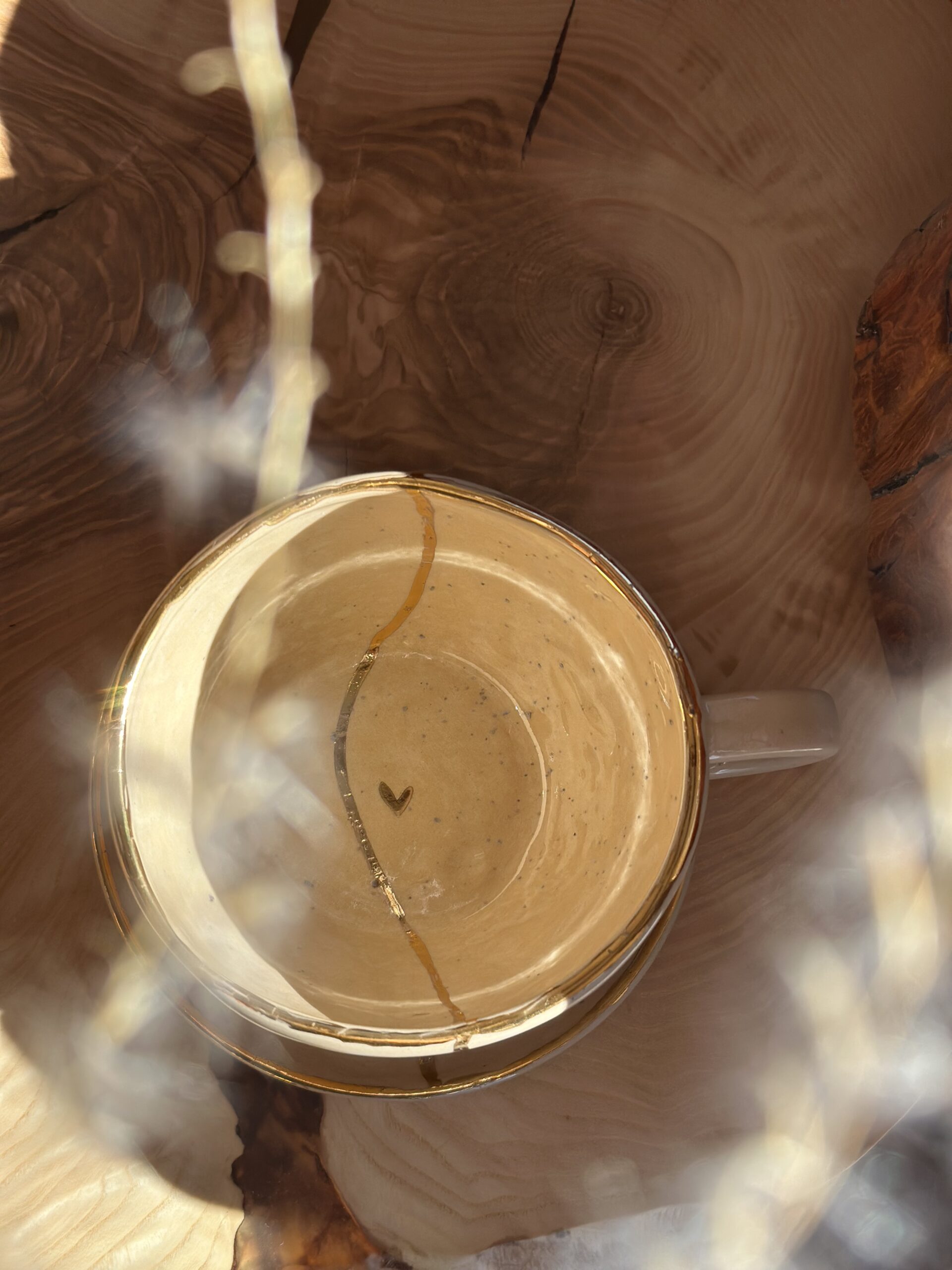 Filiżanka w kolorze różowym z kremowym spodkiem oraz złotym sercem i rantem