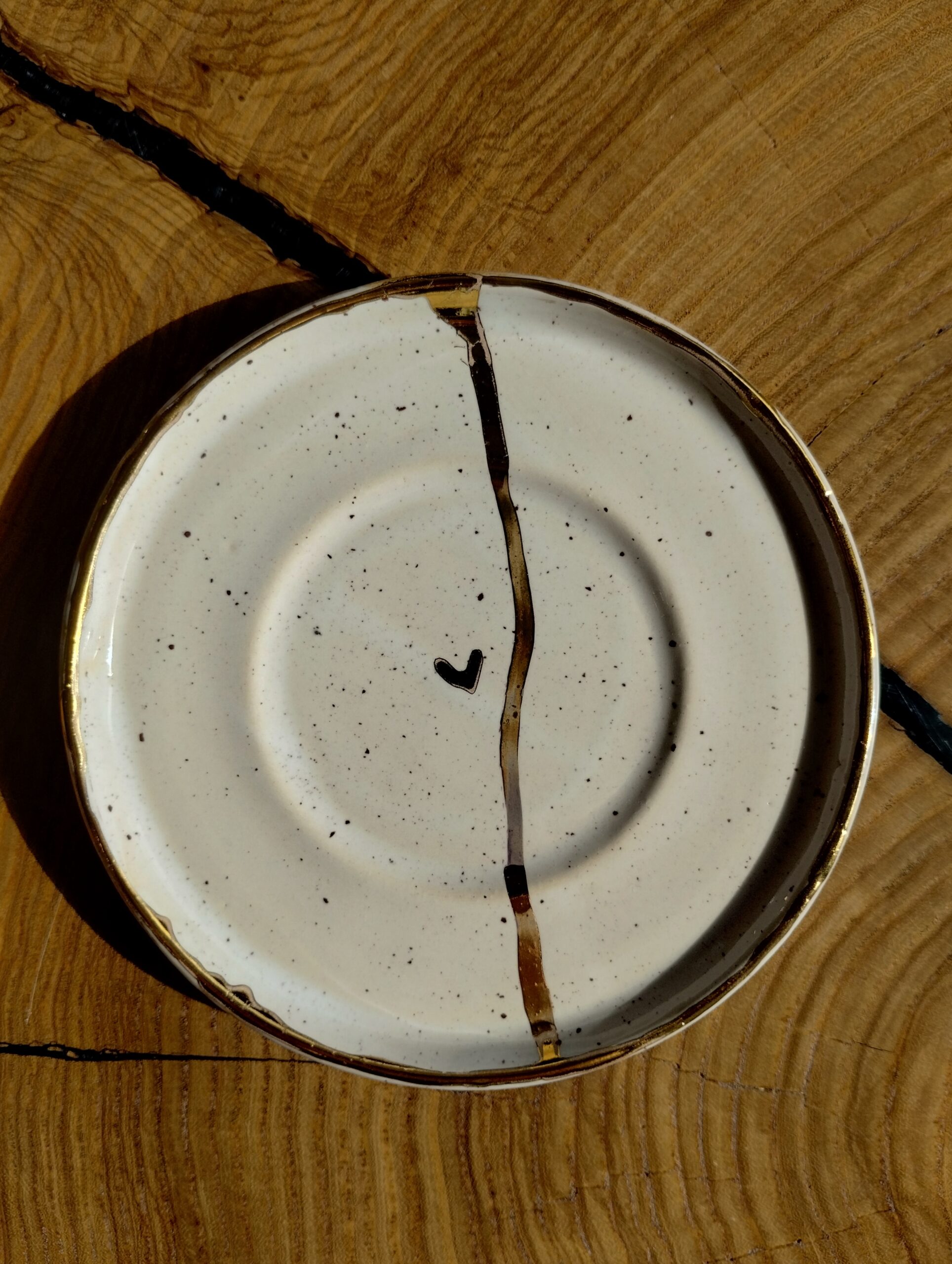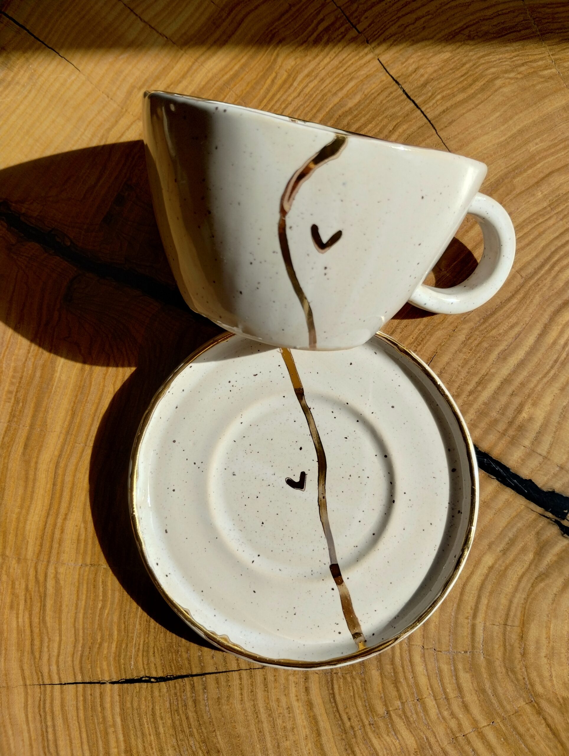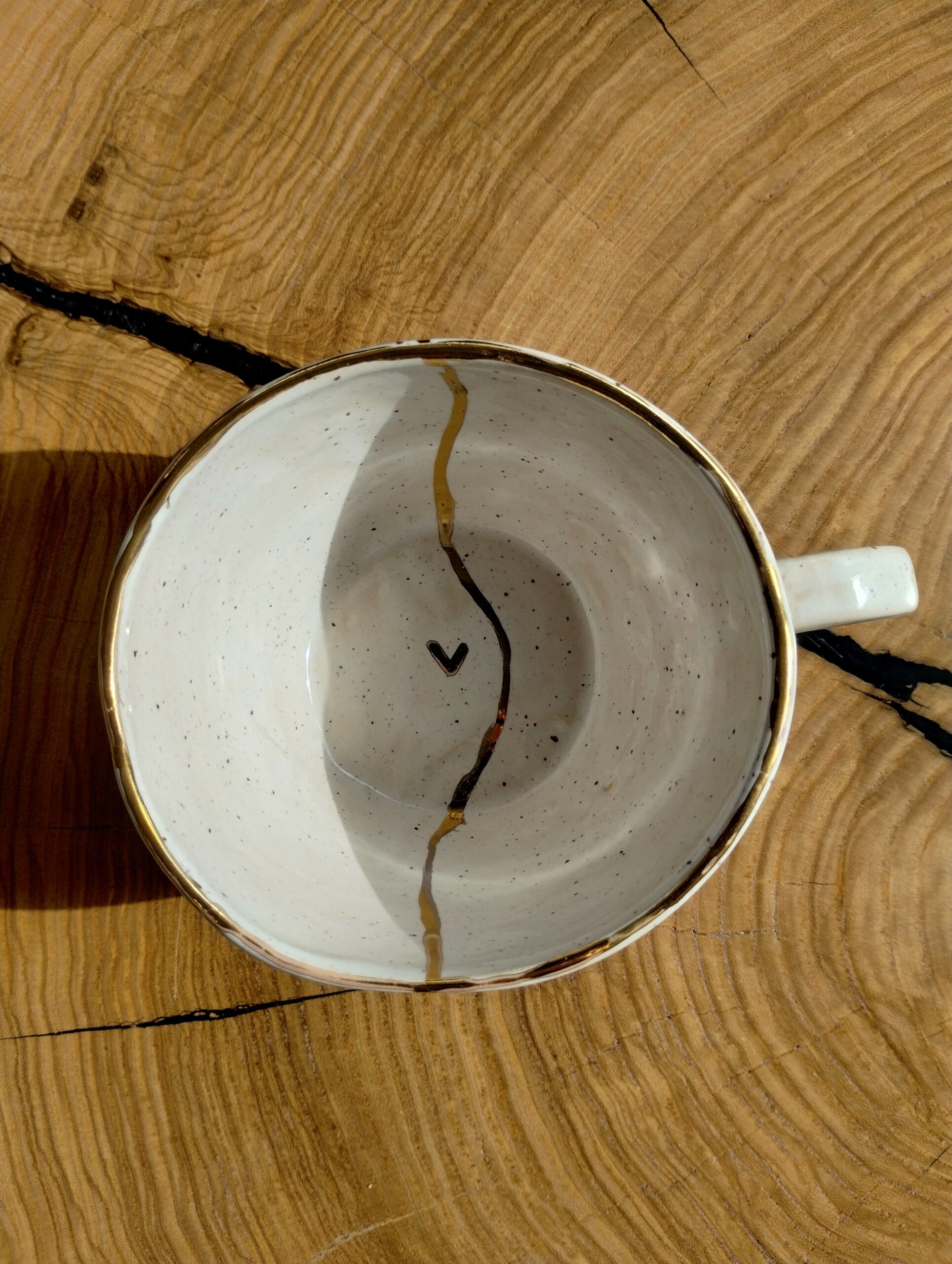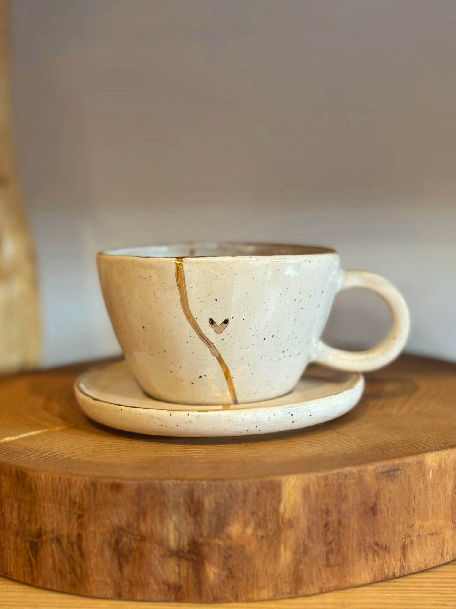 Filiżanka w kolorze naturalnej gliny z delikatnymi ciemnymi kropeczkami i złotym sercem oraz rantem