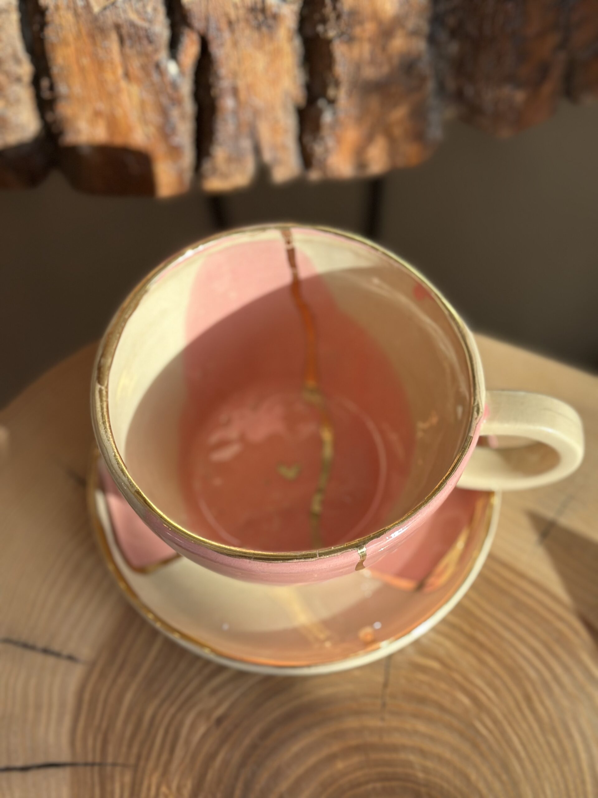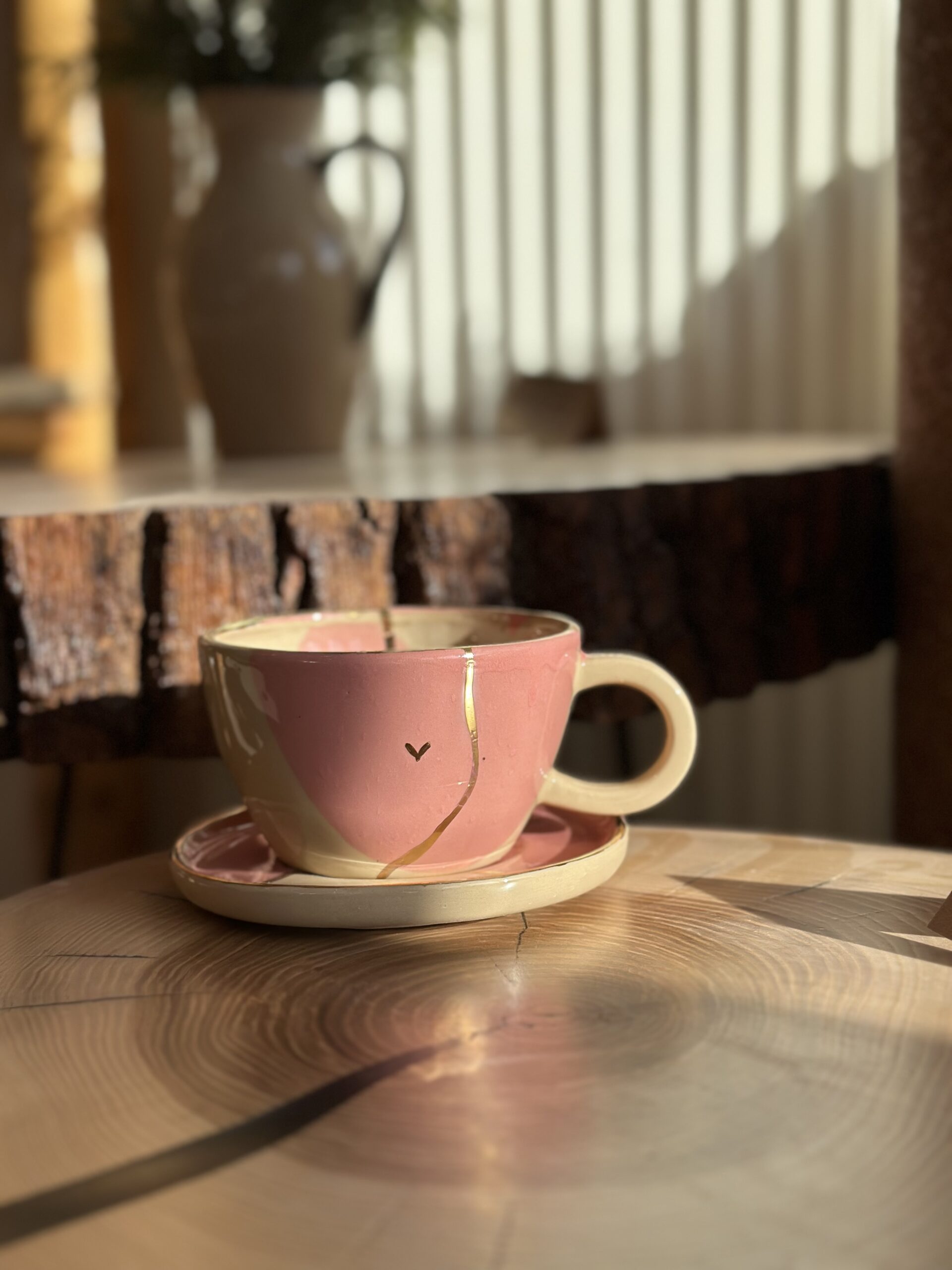 Filiżanka w kolorze naturalnej gliny z ciemno różowym efektem oraz ze złotym sercem i rantem