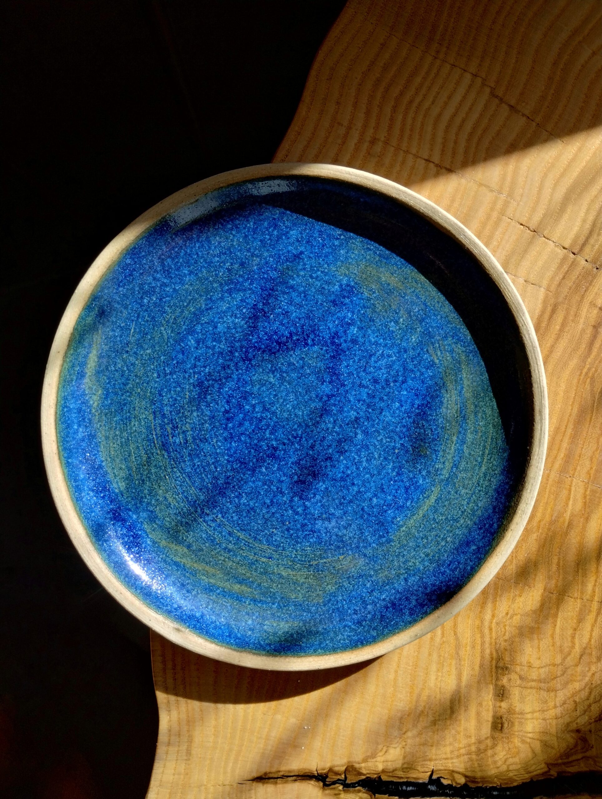 Ceramiczny talerz wykonany z neutralnej gliny, pokryty z wierzchu matowym szkliwem w kolorze granatowym z drobnymi jasnymi kropkami