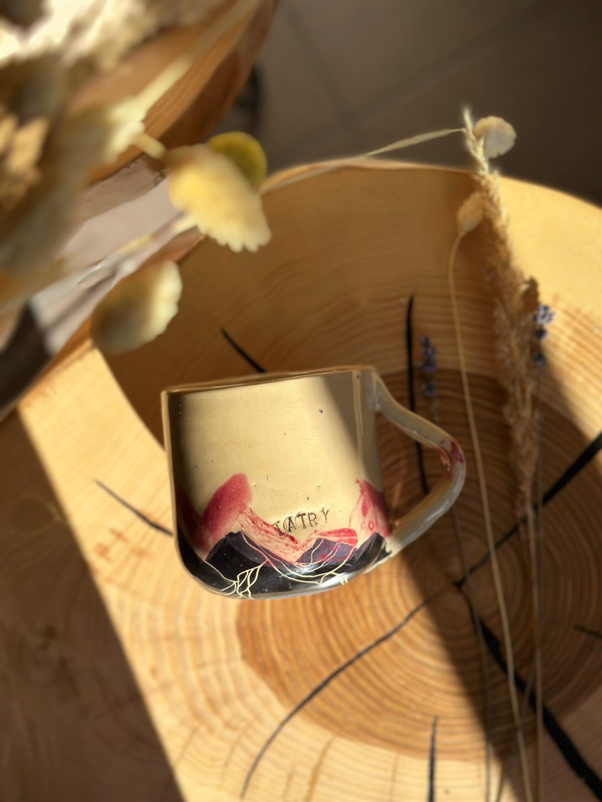 Kubek z malowanymi przeze mnie czarnymi Tatrami oraz bordo efektem nad górami