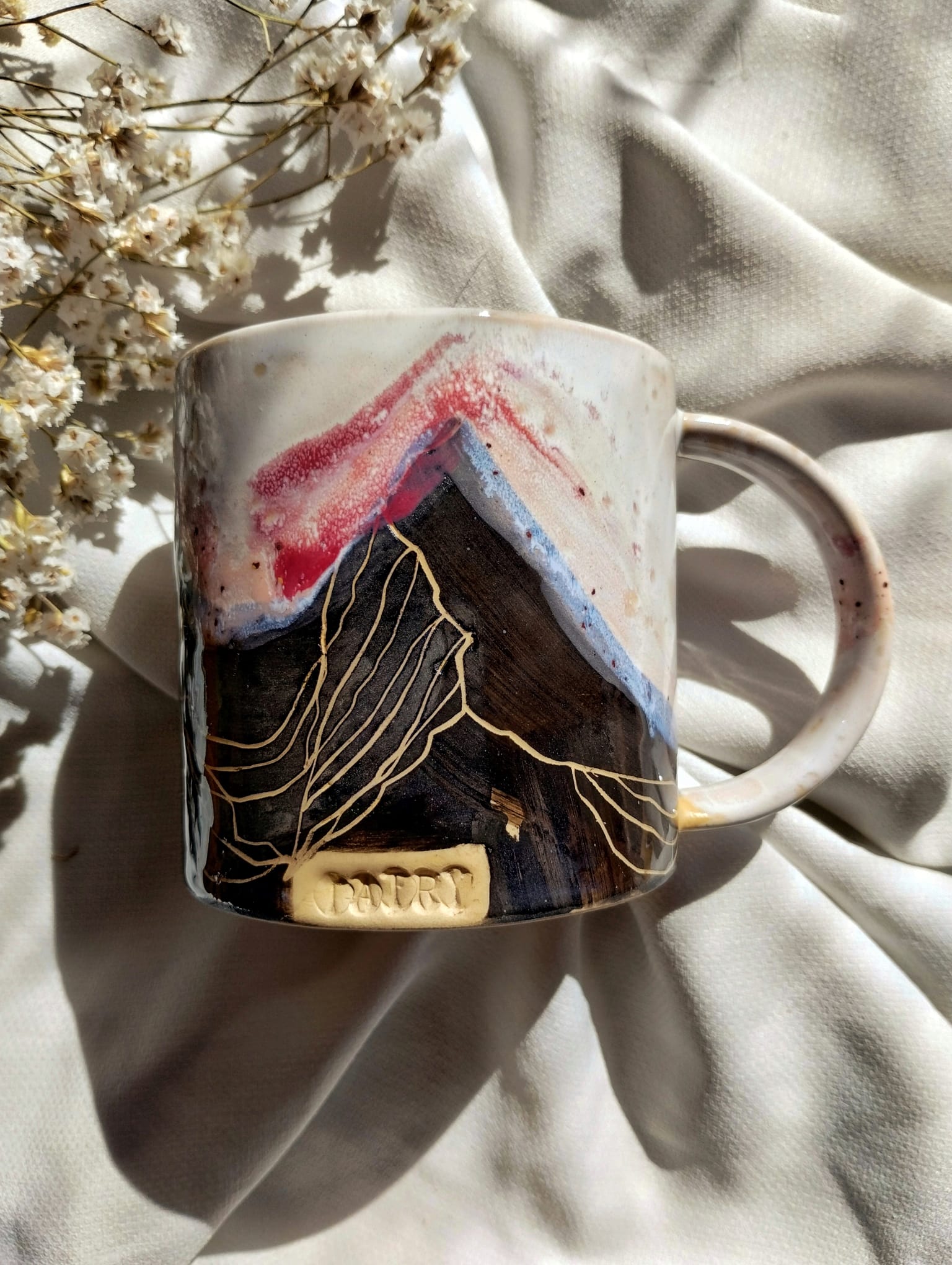 Kubek w kolorze perłowym z bordowymi przebłyskami oraz z motywem panoramy górskiej rysowany przeze mnie na dolnej części powierzchni kubka