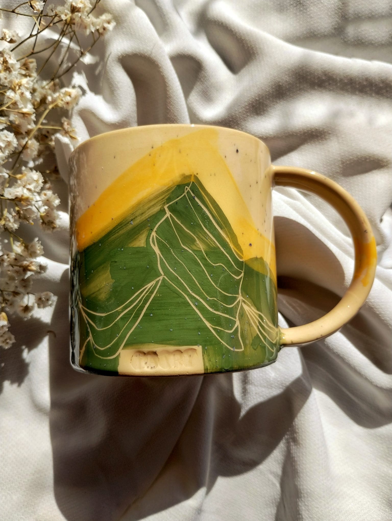 Kubek w kolorze pomarańczowym z motywem zielonej panoramy górskiej rysowany przeze mnie na dolnej części powierzchni kubka