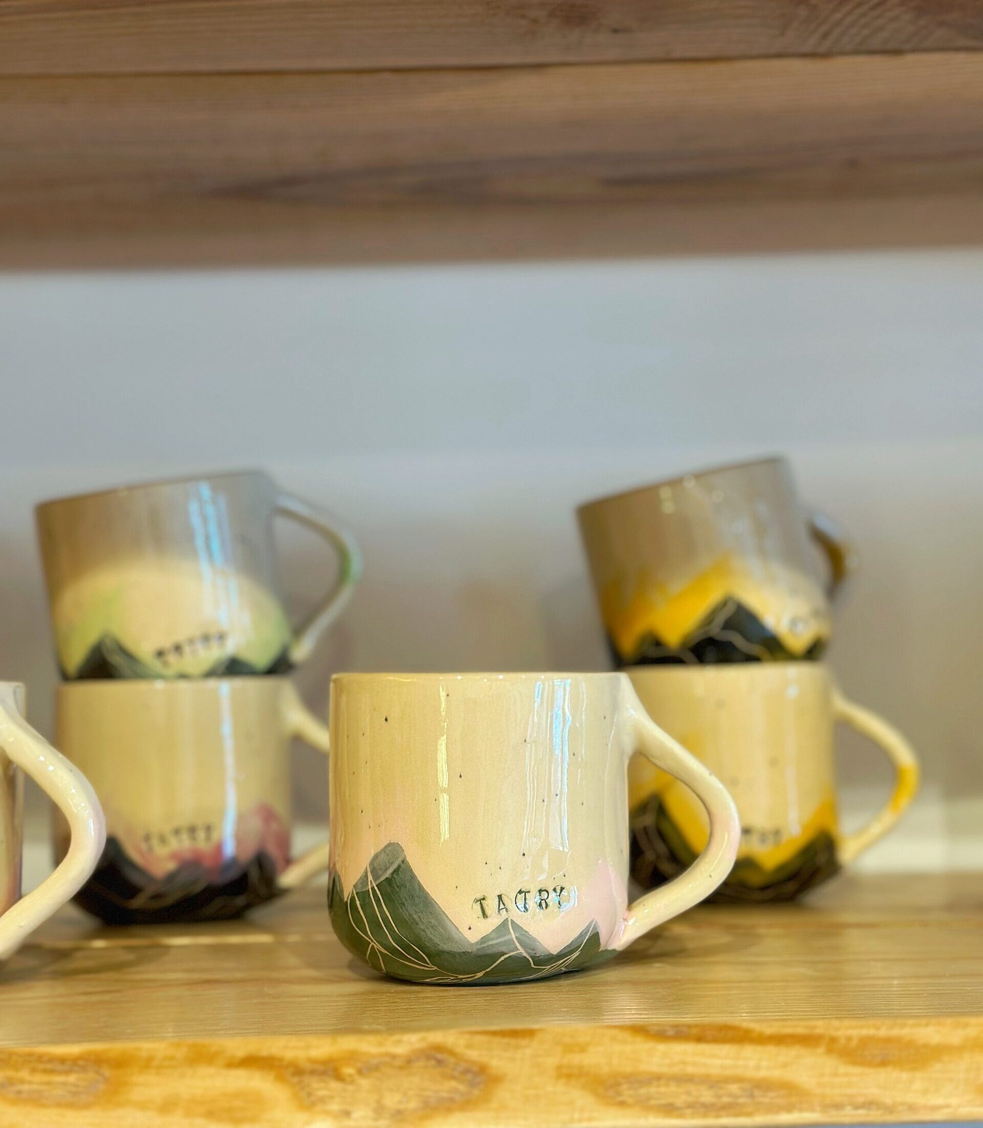 Kubek z malowanymi przeze mnie zielonymi Tatrami oraz różownym efektem nad górami