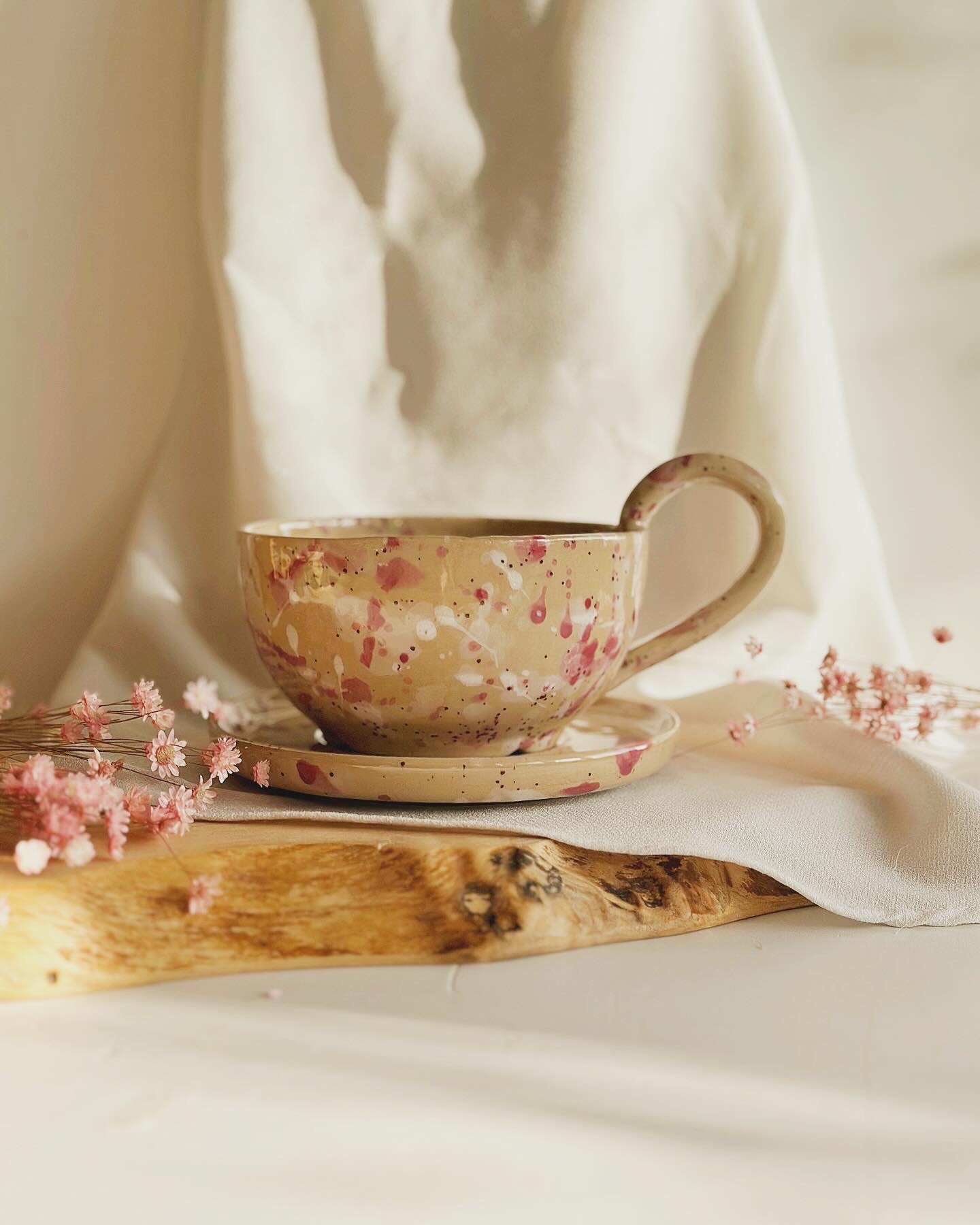 Filiżanka ze spodkiem w pastelowe ciapki na neutralnym tle