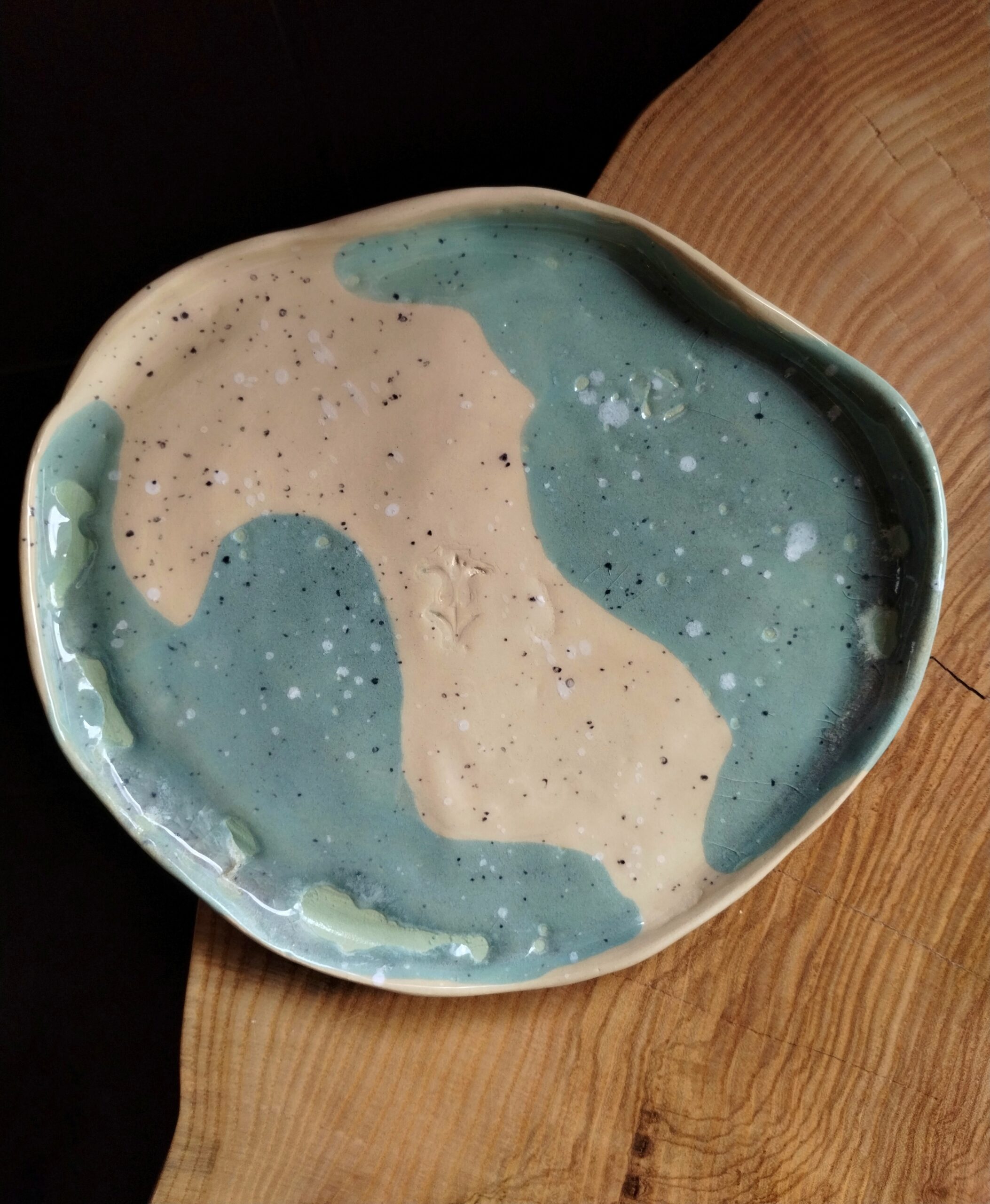 Ceramiczny talerz o nieregularnym kształcie w kolorze niebiesko-beżowym i motywem leluji podhalańskiej.