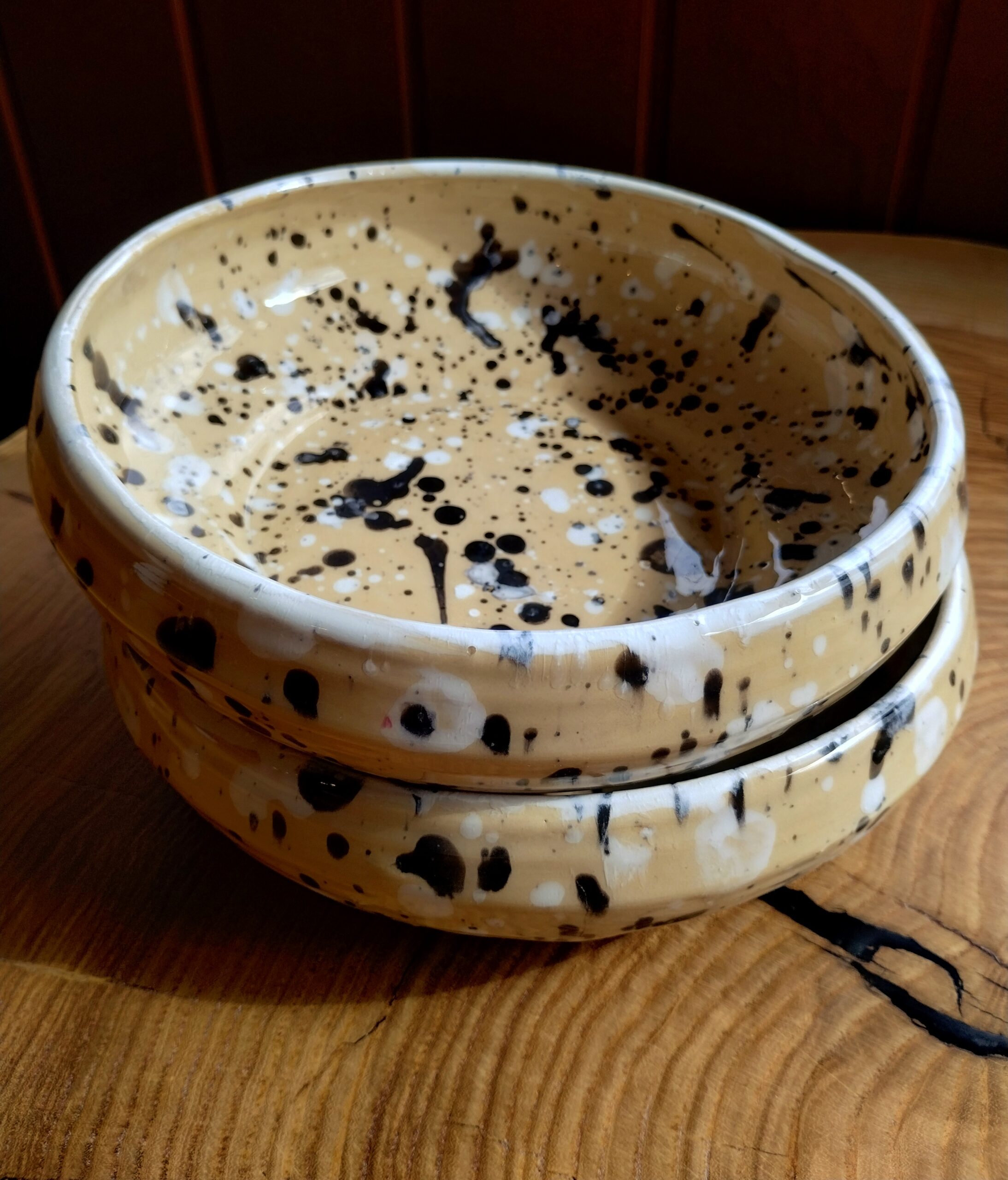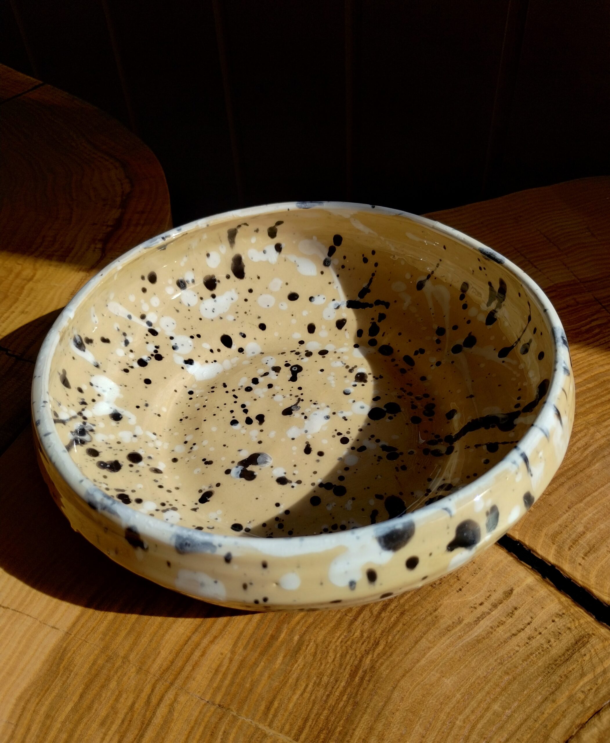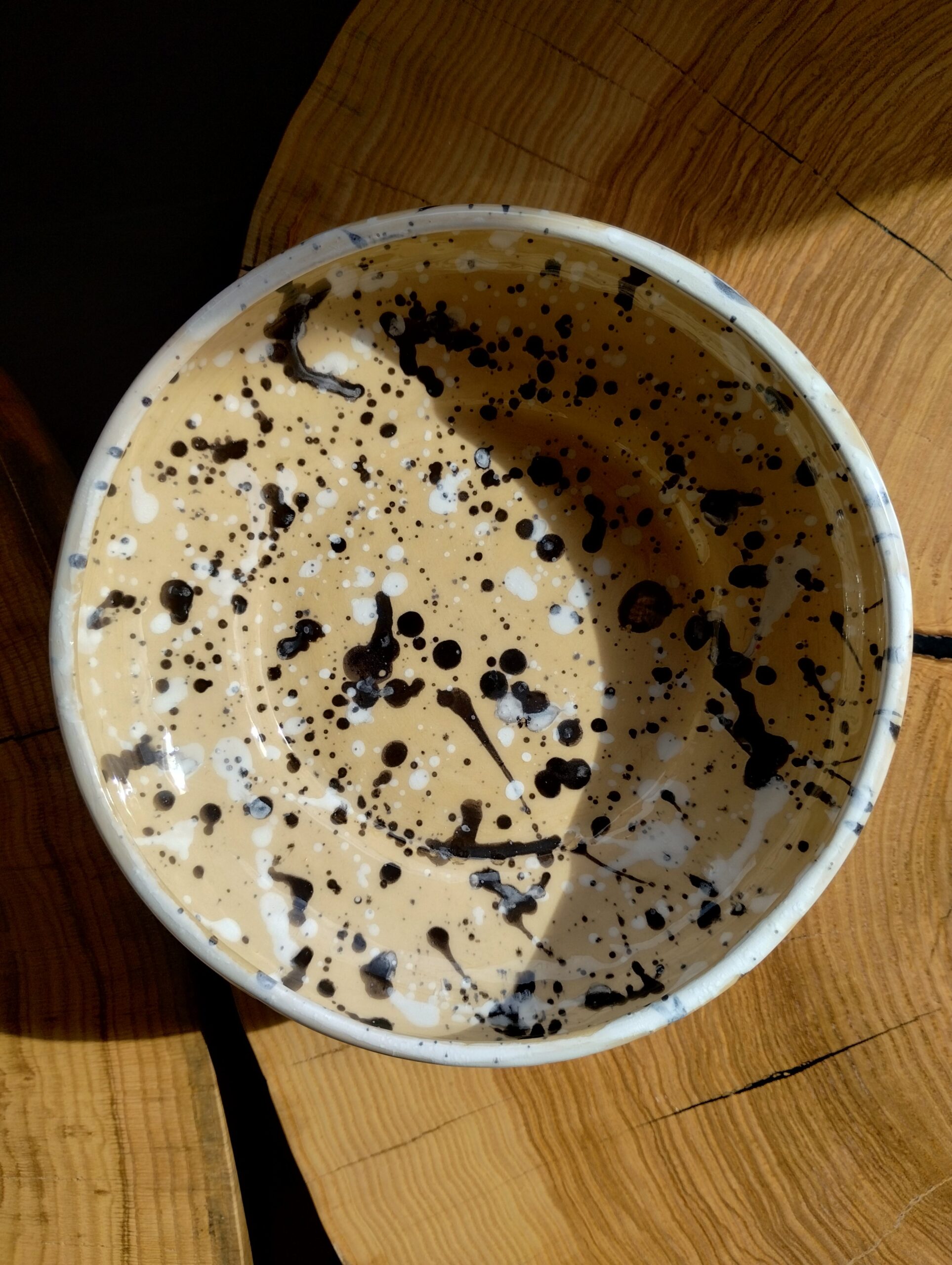 Misa w kolorze neutralnej gliny z czarno-białymi ciapkami i białym rantem.