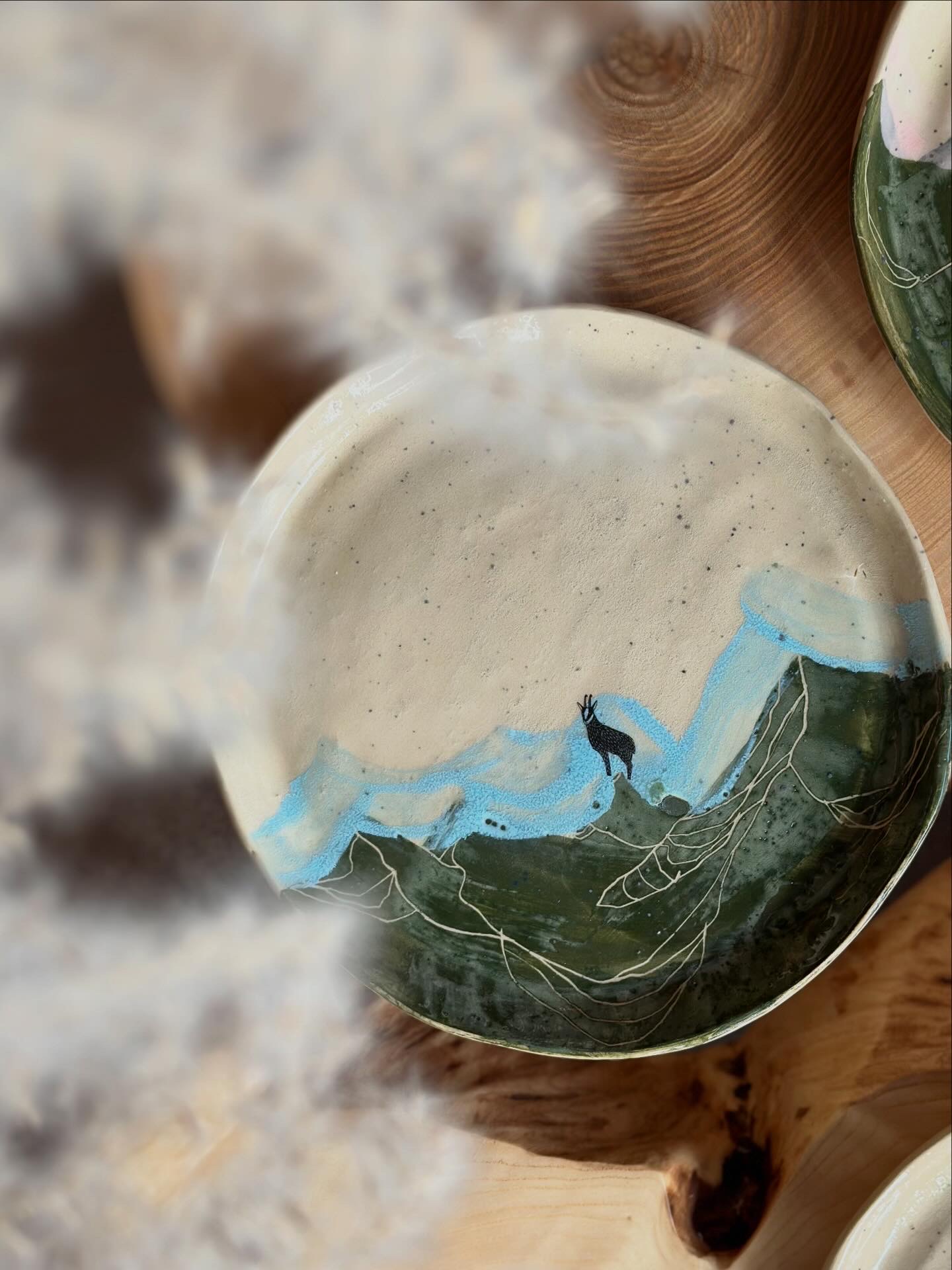 Tatrzański talerz z zielonymi górami oraz niebieskim refleksem i kozicą na szczycie
