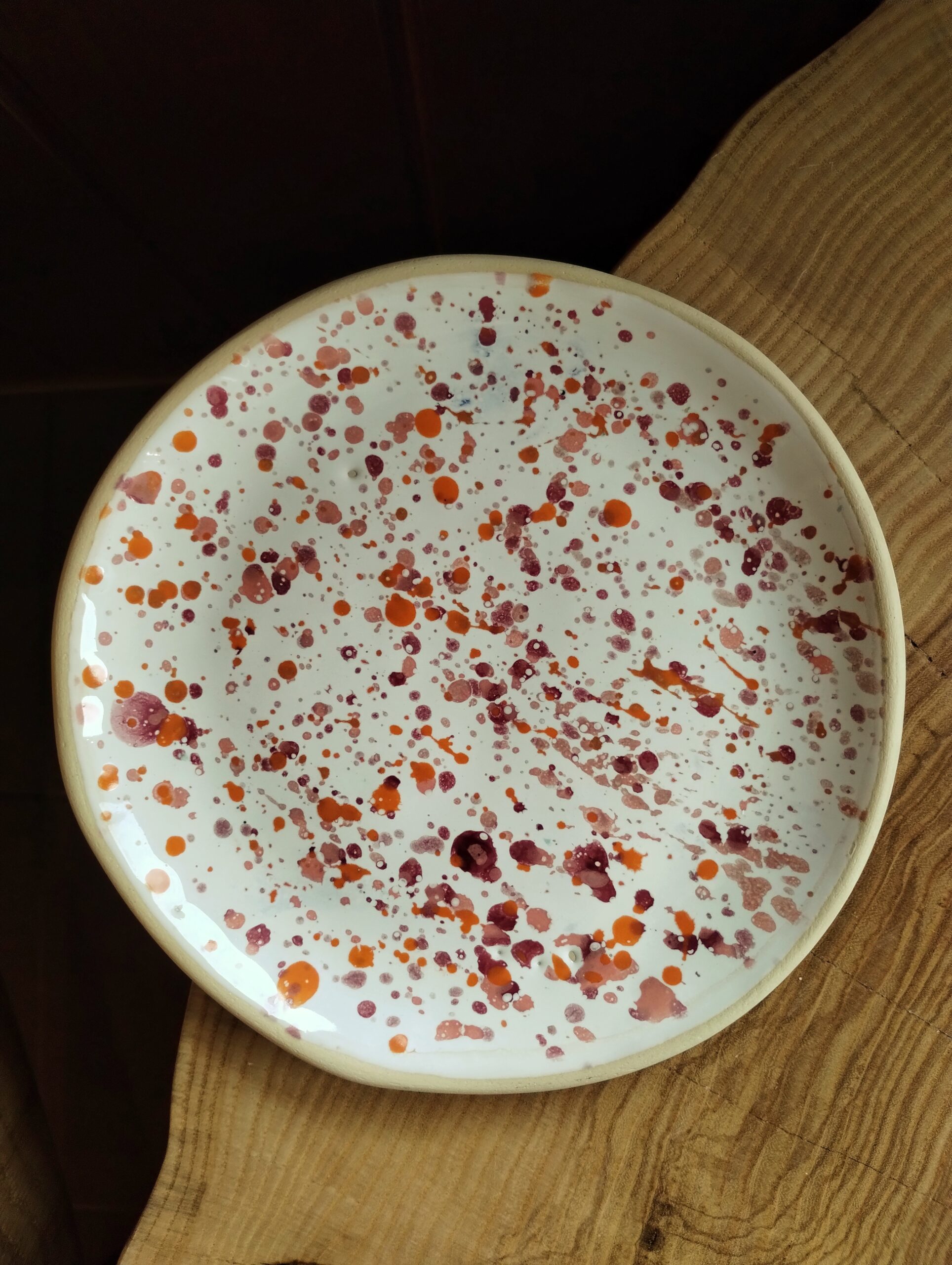 Ceramiczny talerzyk w kolorze białym z ciapkami o kolorze pomarańczowym, różowym oraz bordowym.